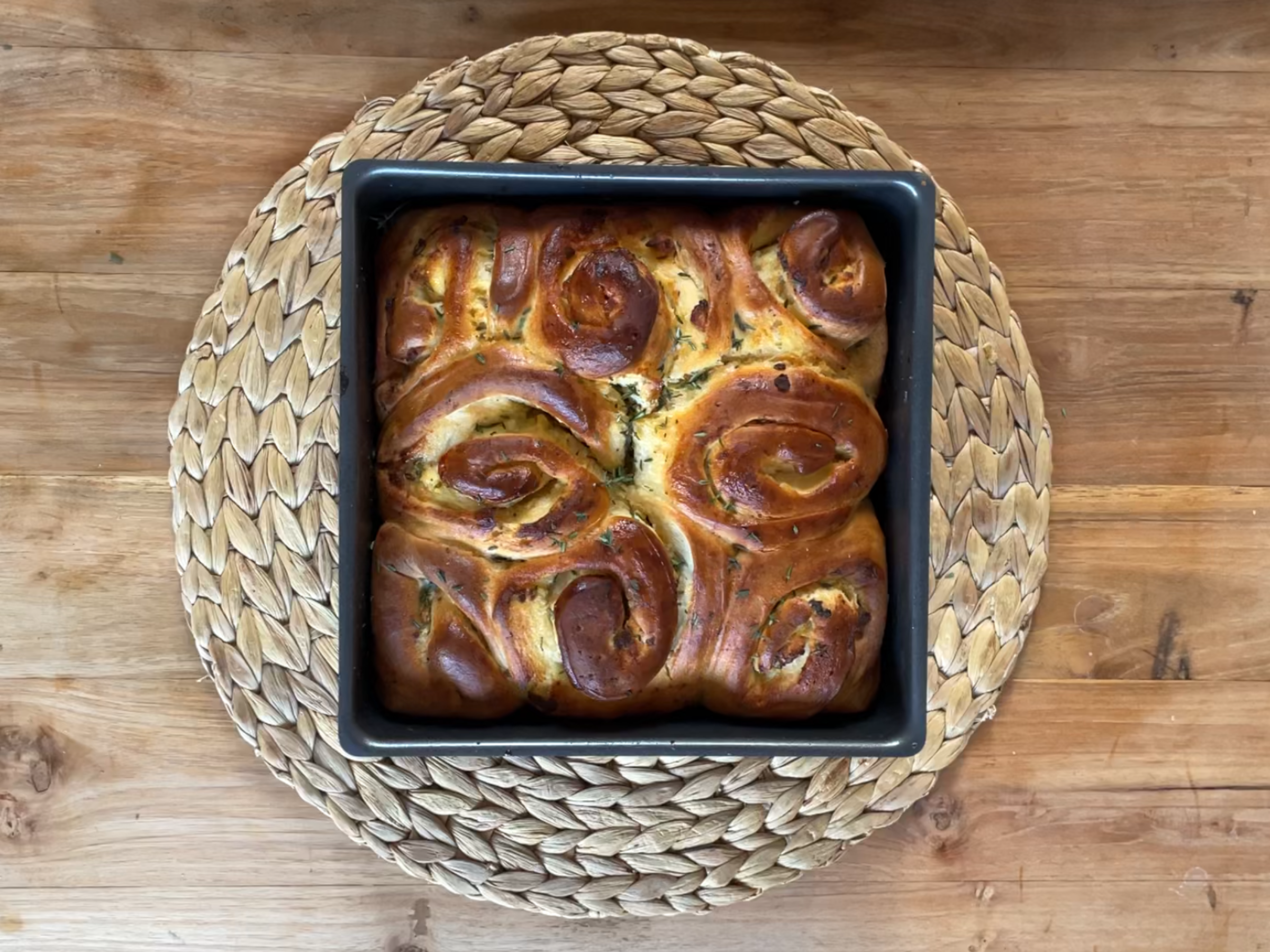 Position an oven rack to the middle position and preheat oven to 175°C (fan forced). Punch the dough down, transfer to a floured surface, then roll into a large rectangle. Brush with melted butter, crumble over the goat cheese, drizzle with honey, and scatter with thyme. Slice into 8 even strips, roll each one into a coil, and nestle into a 22cm square buttered loaf tin (can use any shape or size, but the bread will expand when cooking). - Bake: